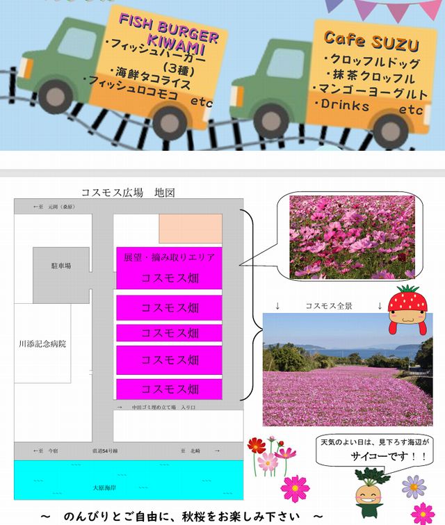 約10,000平方mに広がるピンクのコスモスと海の青との美しいコントラストは必見!当日はフィッシュバーガーやタコライス、クロッフル 、マンゴーヨーグルトなどのキッチンカーが出店。