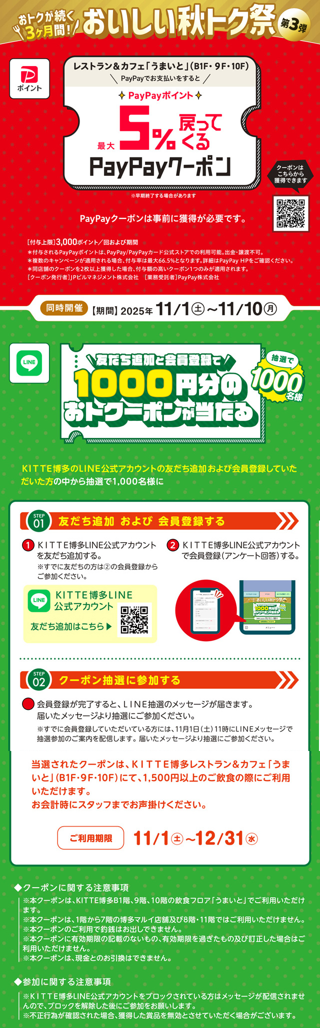 KITTE博多のLINE公式アカウントを友だち追加のうえ会員登録すると、抽選で1,000名様に1,000円分のデジタルクーポンをプレゼント。秋の外食がもっと楽しくなるキャンペーンです。