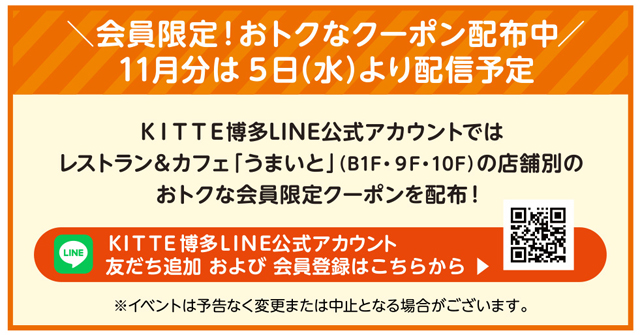 ・内容:KITTE博多のLINE公式アカウントの友だち追加および会員登録していただいた方に、抽選で1,000名様にレストラン&カフェ「うまいと」でご利用いただけるデジタルクーポン1,000円分をプレゼント!