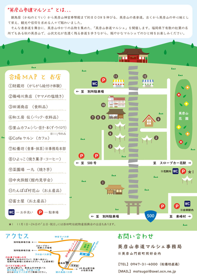 福岡県下有数の紅葉の名所であり、修験の山として人々の祈りが受け継がれてきた英彦山。表参道は約800メートルにも及びます。そんな英彦山参道を舞台に「英彦山参道マルシェ」が開催されます。