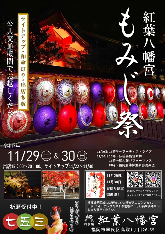 2025年11月29日(土)・11月30日(日)15:00〜20:00、紅葉八幡宮(福岡市早良区高取1-26-55)にて毎年恒例の「もみじ祭」が開催されます。