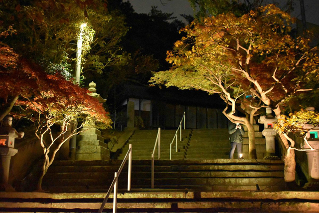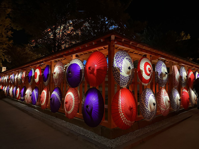境内に植えられた100本の紅葉が美しく色づき、夜のライトアップと和傘明かりが幻想的な空間を演出します。今年の紅葉は暖秋の影響で、12月頭前後が見頃の予想です。