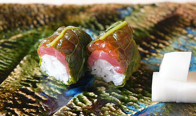 「高菜巻き」は、修業をしていた大阪・北新地の寿司屋の名物。シャリの上に中とろといくらをのせ、塩漬けした高菜で巻いた一品です。さっぱりとした味わいと、噛むと広がる中とろ・いくらの旨みを堪能してください。