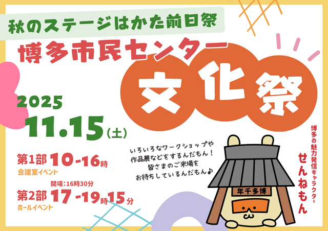 2025年11月15日(土)「博多市民センター文化祭」が開催されます。10時からの会議室イベントでは、フラワーアレンジメントやジェルキャンドルなどのワークショップ、作品展、クイズラリーなど様々なイベントを実施。