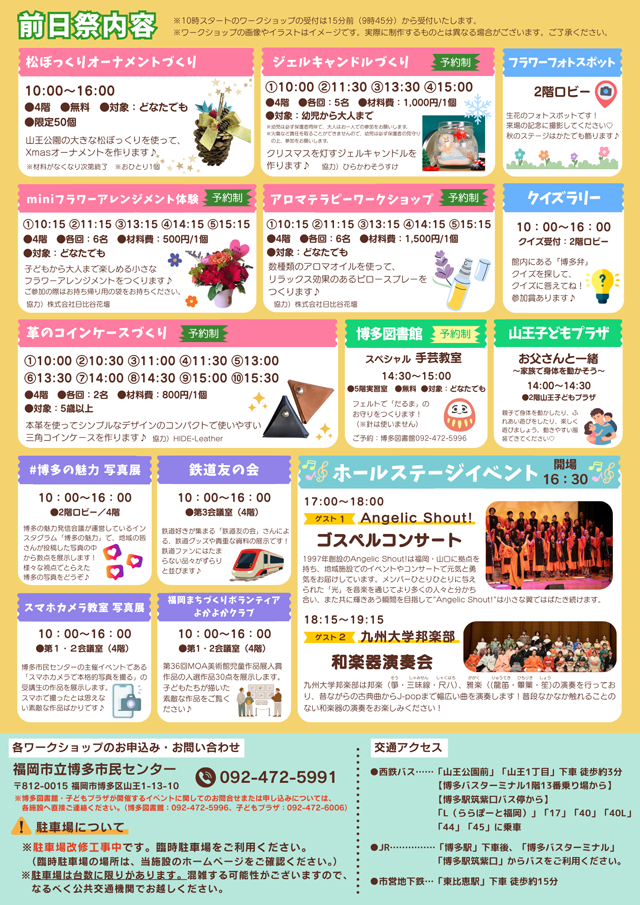 他にも、博多図書館や子どもプラザによる楽しいイベントもあり。さらに、17時からのホールイベントでは、Angelic Shout!による「ゴスペルコンサート」や九州大学邦楽部による「和楽器演奏会」を開催!