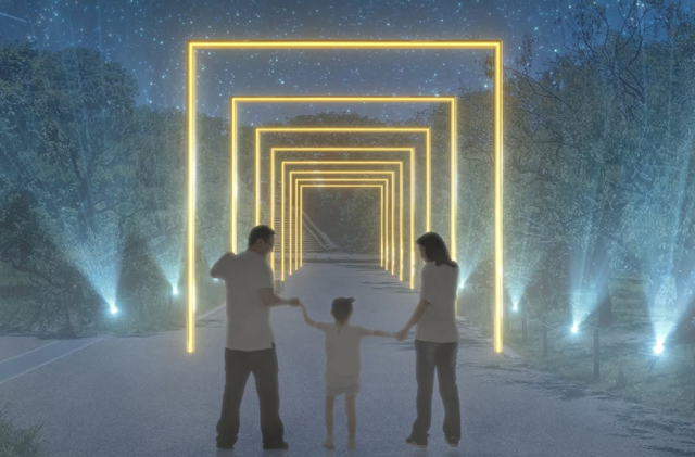 桜園の中心にある茅の輪をくぐり、御神木へ入口で配布される提灯をかざすと、光のエネルギーが広がり、桜園全体のライトアップと連動する参加体験型の演出が楽しめます。