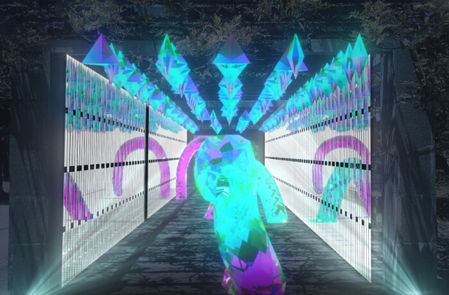 表御門を光のゲートとして再現。入口では提灯を受け取り、おみくじを引いてから回遊をスタートできます。