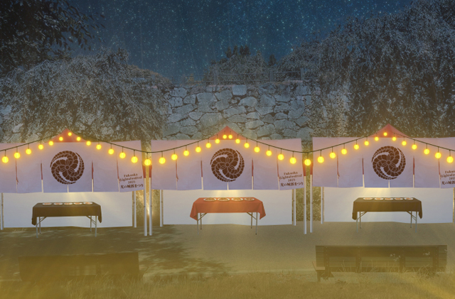 福岡城・舞鶴公園の「過去と未来」をコンセプトに、かつて本丸にあったという御神木や、当時存在していた門など、歴史の記憶を継ぎデジタルの「光の城郭」とリアルな「城郭屋台街」が出現。