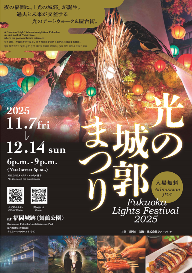 2025年11月7日(金)~12月14日(日)18:00~21:00(屋台街は17:00~)、福岡城・鴻臚館エリア(福岡市中央区城内)にて「Fukuoka Lights Festival2025~光の城郭まつり~」が開催されます。