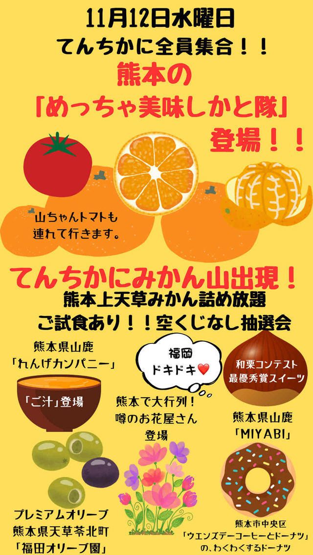2025年11月12日(水)10:00~20:00、天神地下街1番街イベントコーナーにて「てんちかに全員集合!!熊本の『めっちゃ美味かと隊』登場!!」が開催されます。
