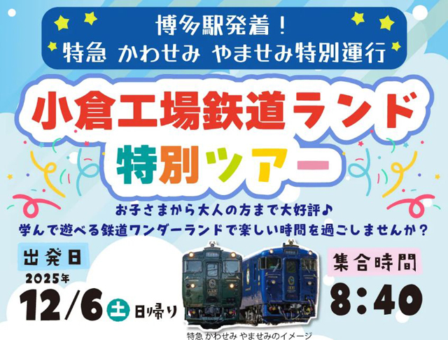 JR九州旅客鉄道株式会社は、2025年12月6日(土)に実施予定の、日帰り JR九州オリジナルツアー「『特急 かわせみ やませみ』特別運行!小倉工場鉄道ランド特別ツアー」を販売しています。