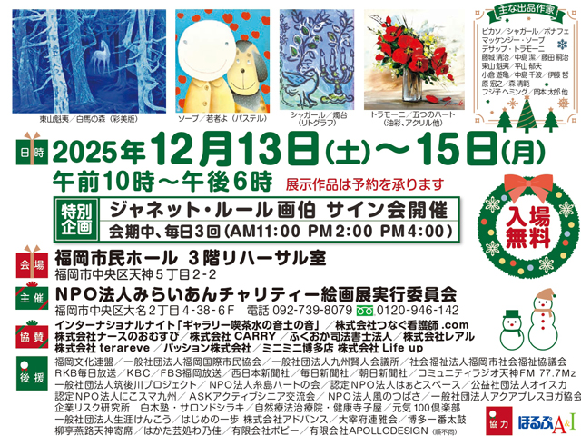 2025年12月13日(土)~12月15日(月)10:00~18:00、福岡市民ホール/3階リハーサル室(福岡市中央区天神5丁目2-2)にて、「現代国際巨匠絵画展~あきらめない支援・みらいあんしん~」が開催されます。