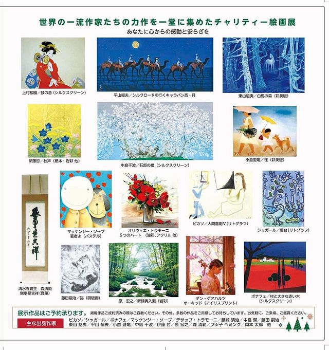 地域支援を行うNPO法人みらいあん設立10周年を記念して、世界と日本の巨匠たちによる名画を一堂に展示します。ピカソ、シャガール、東山魁夷など約50名、約120点の油彩や版画などが並ぶ貴重な機会です。