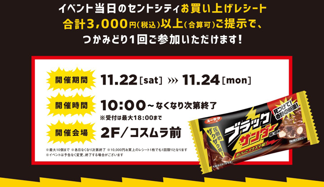 2025年11月22日(土)~11月24日(月)の3日間限定、セントシティ(北九州市小倉北区京町3-1-1) 2F コスムラ前にて「ブラックサンダーつかみ取り」が開催されます。