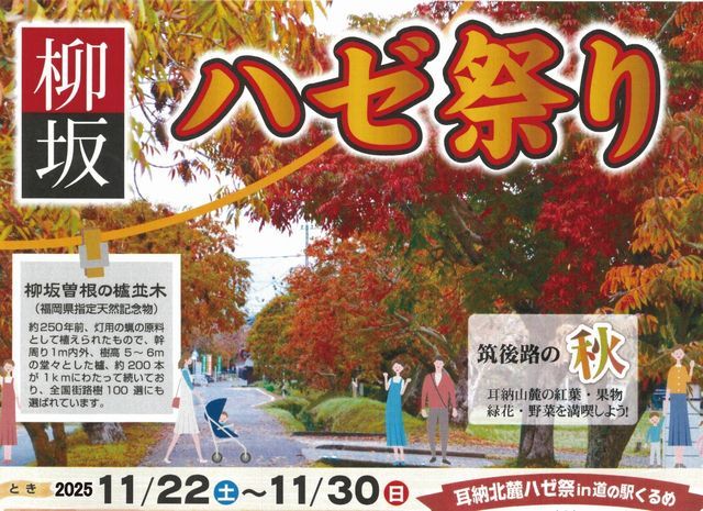 柳坂曾根のハゼ並木は、今から約280年以上前、久留米藩が寛保2年に灯明用の蝋の原料として植樹されたもので「伊吉ハゼ」を中心に200本、約1.2Kmの並木道です。
