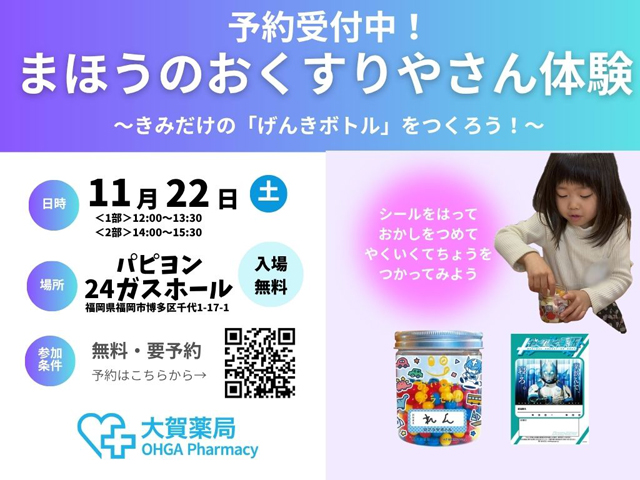 2025年11月22日(土)パピヨン24 ガスホール(福岡市博多区千代1丁目17-1)にて「まほうのおくすりやさん体験(要予約)」が開催されます。