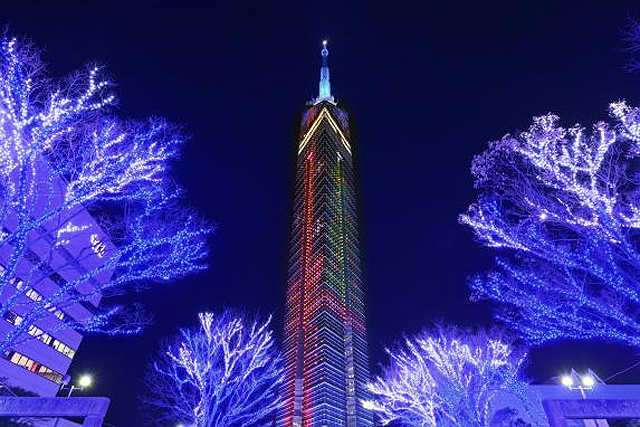 福岡のシンボル・福岡タワーに、日本最大級となる全長108mの巨大クリスマスツリーが点灯。時折サンタクロースが現れる演出もあるので、お見逃しなく。