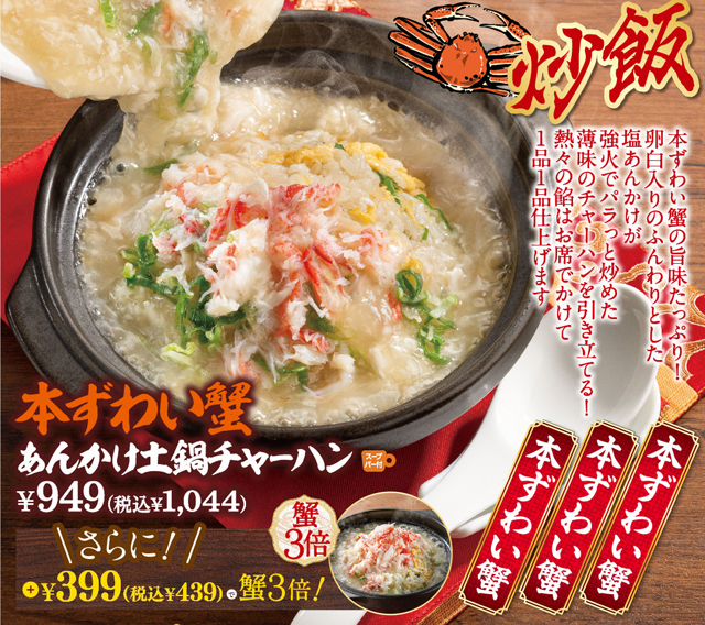 昨年47万食販売「本ずわい蟹あんかけ土鍋チャーハン」。昨年も大人気の主役メニュー。本ずわい蟹の旨味満載のあんかけ土鍋チャーハンが待望の復活!熱々の餡はお席で提供時にかけるため、「ジュージュー」という音も一緒に楽しめる一品です!