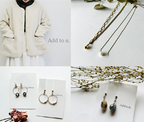 add(アッド)には“加える・追加する”といった意味があります。Add to…あなた自身に「あなたの生活に+され」より、あなたが輝きますように。珍しい海外のビーズやパーツなどを使ってアクセサリーを制作しています。セレクトしたお洋服や小物も並びます。