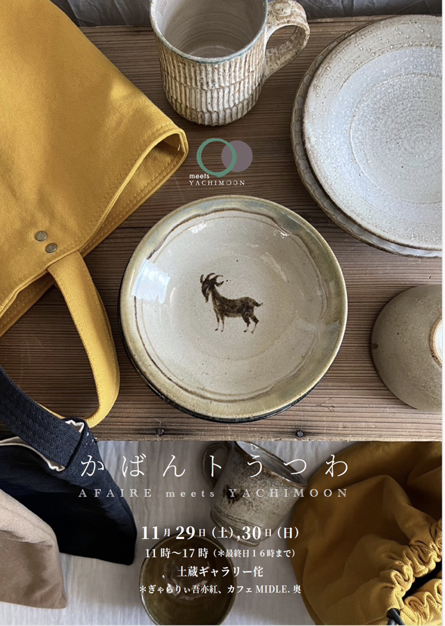 シンプルで使い勝手の良いこだわりのある物作りに定評のあるA FAIRE(エフェール/長崎)と、沖縄のやちむんを中心に食を愉しむための提案を各地で続けているYACHIMOON(ヤチムーン/糸島)のコラボレーションイベント。