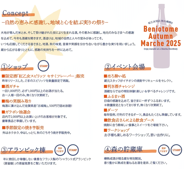 2025年11月22日(土)~11月23日(日)10:00~16:00、紅乙女耳納蒸留所(久留米市田主丸町益生田270-2)にて、紅乙女酒造 秋の蔵開き「Beniotome Autumn Marche 2025」が開催されます。入場無料。