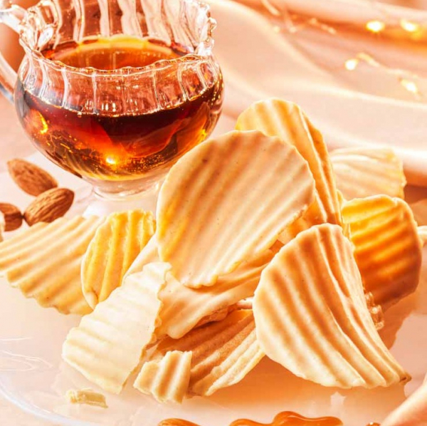 メープルのやさしい甘さと香ばしさがクセになる!メープルシュガーとアーモンドプラリネペーストを加えたチョコレートを、パリッとしたポテトチップの片面にコーティングしました。ほんのり塩味のポテトチップとやさしいメープルシュガーの風味が絶妙なバランスの、手が止まらなくなるおいしさです。後味にほんのりナッツが香ります。
