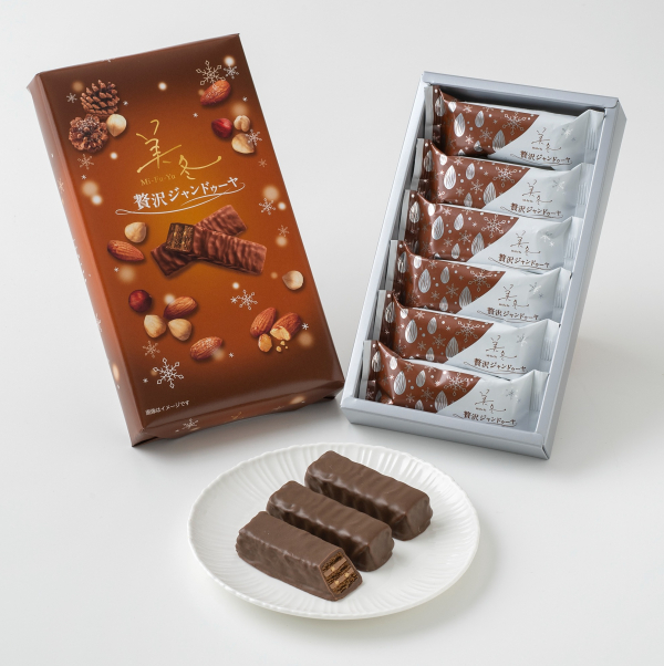 芳醇な香りが広がる、ちょっぴり贅沢なミルフィーユ「美冬(みふゆ)贅沢ジャンドゥーヤ」が新発売!ヘーゼルナッツとアーモンドのジャンドゥーヤフィリングをサクサクのココアパイでサンドし、くちどけなめらかなクーベルチュールのミルクチョコレートで包みました。今年は新たに、フィリングにアーモンドダイスが加わり、香ばしさと食感がパワーアップしました。口に入れた瞬間に広がるナッツの風味と空気の層を抱いたパイの食感をお楽しみください。