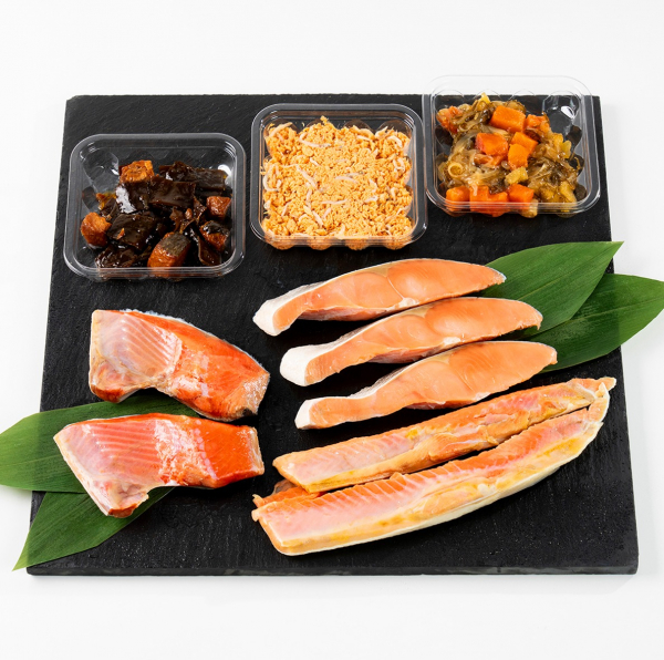 定番人気の詰め合わせ。全て天然の鮭を使用してます!鮭づくしの詰め合わせをぜひご賞味ください。標章登録のサーモン松前は椎野商店のオリジナル商品です。【内容】紅鮭カマ約250g×1、天然紅鮭ハラス約170g×1、時鮭切り身3切約250g×1、鮭ちりめん80g×1、鮭昆布80g×1、サーモン松前80g×1