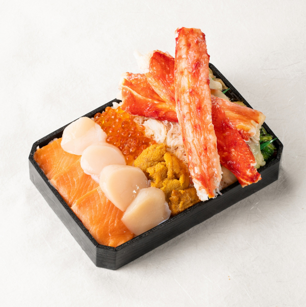 まるで玉手箱のようなお弁当。タラバ棒肉が3本、サーモン・帆立・ウニなどがのったお弁当。タラバ棒肉の下から、豪華海鮮が出てくる!ワクワク贅沢なお弁当です。