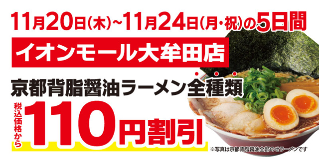 オープンを記念し、11月20日(木)~11月24日(月・祝)の5日間限定「京都背脂醤油ラーメン」を特別価格(110円割引)にて提供。幅広い年代の方に食べていただける魁力屋自慢の看板商品です。