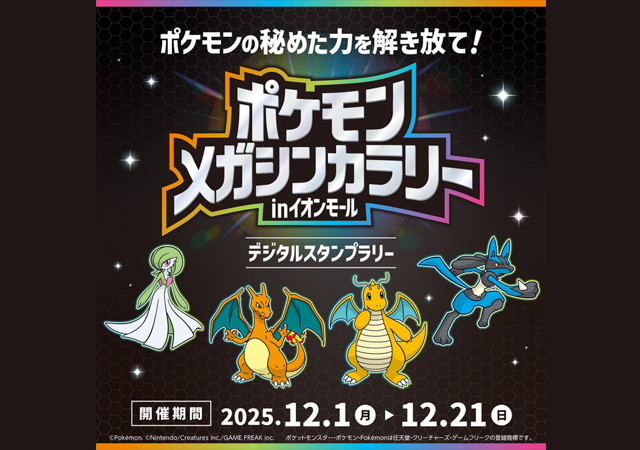 2025年12月1日(月)~12月21日(日)イオンモールでポケモンとあそぼう!第6弾、「ポケモンメガシンカラリー in イオンモール」を開催。