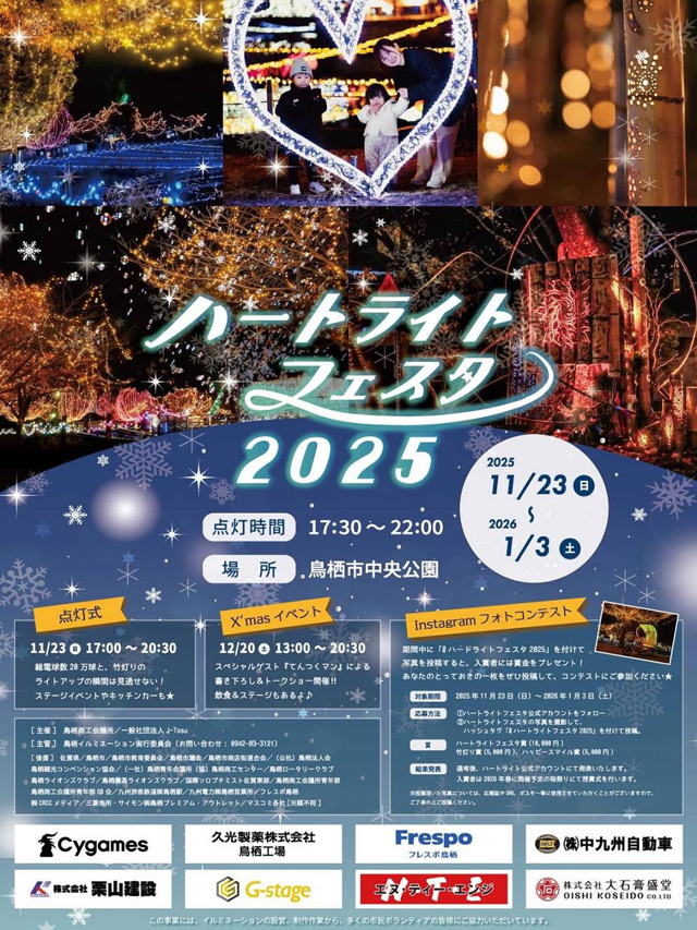 2025年11月23日(日)~2026年1月3日(土)中央公園(鳥栖市大正町824-1 フレスポ鳥栖横)にて、鳥栖の冬の祭典「ハートライトフェスタ2025」が開催されます。