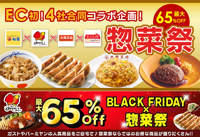 史上初!「松屋 × すかいらーく × 大阪王将 × ジョイフル」が初コラボ。2025年11月27日(木)~12月2日(火)までの期間、au PAYマーケットで開催の「BLACK FRIDAY 2025」と連携した「惣菜祭」を開催。