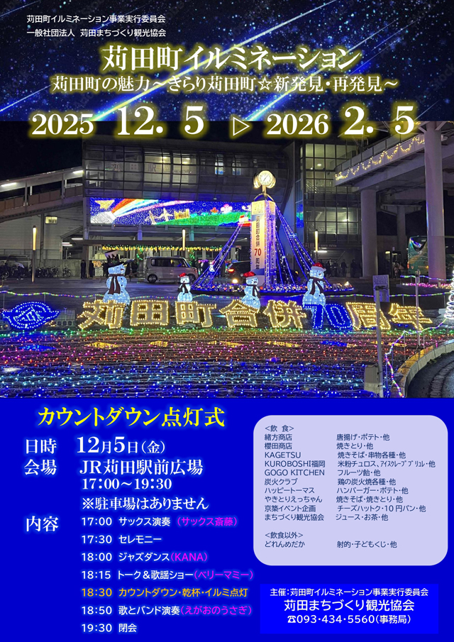 2025年12月5日(金)~2026年2月5日(木)17:30~22:30、構想から制作・設営まで産・官・学が連携して手作りで行うイルミネーション「苅田町イルミネーション」(京都郡苅田町堤3434 JR苅田駅前)が開催されます。