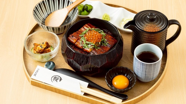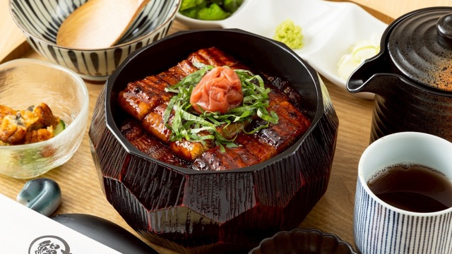 関東風の焼き方で仕上げた鰻は外はサクッと、中はフワっとした食感が絶品!うざくやお吸い物、わさび・ネギ・お漬物などの薬味、温かいお茶がセットになっています。