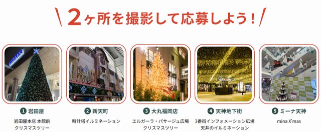 対象のクリスマススポットで写真を撮って応募すると天神13施設のお買物券が当たるチャンスです!