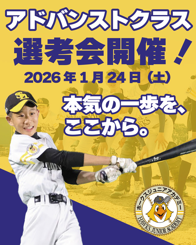ホークスジュニアアカデミー ベースボールスクールでは、2026年1月24日(土)に新小学5年生・6年生を対象にしたジュニア最上級クラス「アドバンストクラス」2026年度生の選考会を開催します。