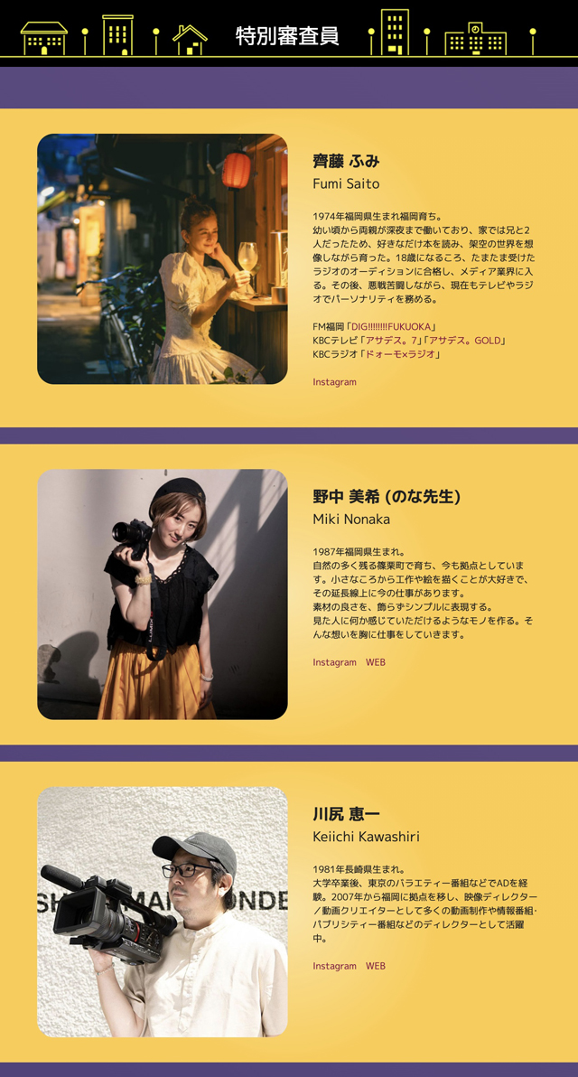 特別審査員には、「エモ電フォトコンテスト」や「エモ電旅-電柱パチリ部-」、10⽉からの新企画「ネオ電旅-ネオパチリ部-」にもご参加頂いている、タレントで福岡のテレビ番組・ラジオパーソナリティーでおなじみの「⿑藤 ふみ」⽒&写真家の「野中 美希(のな先⽣)」⽒と、動画クリエイター&福岡の情報番組を中⼼に⼿掛ける番組ディレクターの「川尻 恵⼀」⽒の3名が担当します。