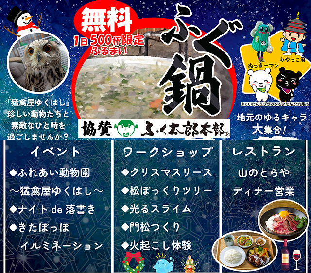 焚き火体験や、ふぐ鍋の無料振る舞いも行います。16時からはペットの入場もOKです。ワークショップ、猛禽屋は13時から開催。