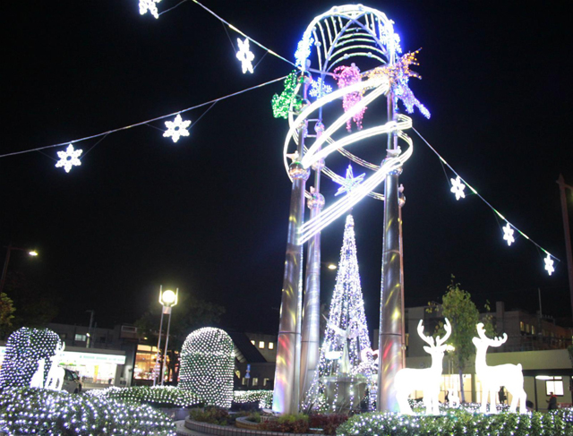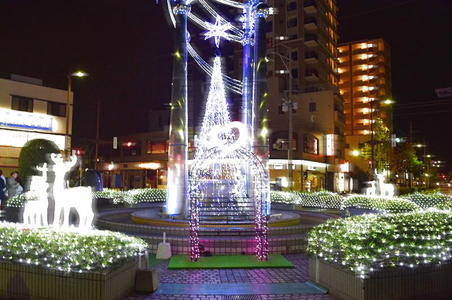 西鉄小郡駅前のシンボル「きらめきの塔」がイルミネーションの時期にライトアップされます。※画像は過去開催の様子