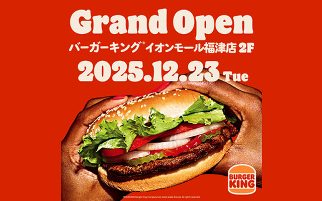 2025年12月23日(火)、イオンモール福津 2F(福津市日蒔野6丁目16番地の1)タリーズコーヒー横に「バーガーキング® イオンモール福津店」がオープンします。営業時間は10:00~21:30。