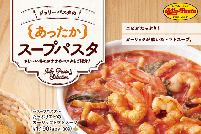 ジョリーパスタでは「今月のおすすめ」と題して、毎月異なるテーマでパスタを販売しています。今回は、たっぷりの具材をつかった“スープパスタ”が登場。これからの季節にぴったりなジョリーパスタの冬の定番商品です。