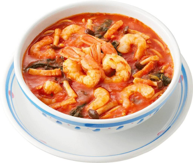 2類のエビとガーリックをつかったトマトスープのパスタです。ぷりぷりの赤エビやむきエビ、しめじ、ベーコン、ほうれん草などの旨みがトマトの程よい酸味やガーリックの風味と絶妙にマッチ。ガツンと香るガーリックが食欲をそそります。トマト×ガーリックのやみつきになる味わいを堪能してください。