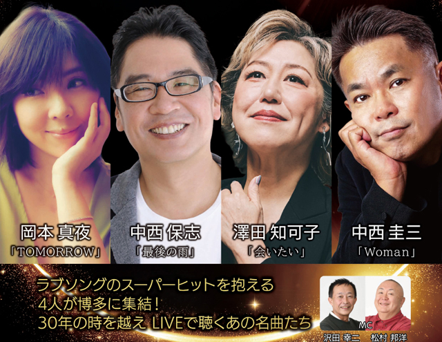 ラブソングのスーパーヒット曲を抱える4人が博多に集結!代表曲以外にも80~90年代のヒット曲をメドレーでお届けします。