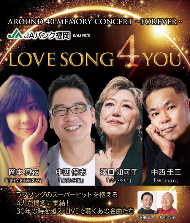 2026年3月3日(火)19:00開演(18:15開場)福岡市民ホール 大ホール(福岡市中央区天神5丁目2-2)にて「AROUND 40 MEMORY CONCERT~FOREVER~ JAバンク福岡 presents LOVE SONG 4 YOU」が開催されます。