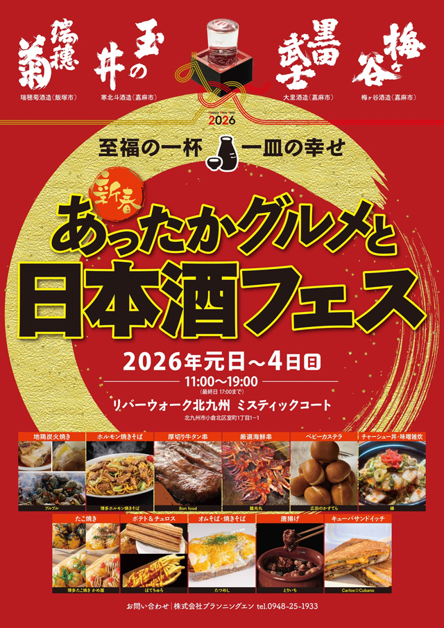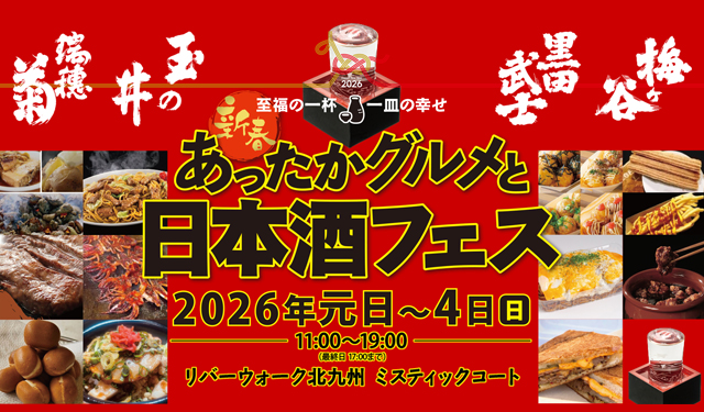 2026年1月1日(元日)~1月4日(日)11:00~19:00(最終日は17:00まで)、リバーウォーク北九州(北九州市小倉北区室町1-1-1)1Fミスティックコートにて、「新春!あったかグルメと日本酒フェス」が開催されます。