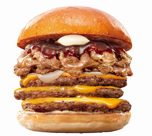 「ダブル絶品チーズ牛カルビバーガー」の、牛肉100%のパティとレッドチェダーチーズをそれぞれ3枚に増量した、トリプルサイズのボリューム満点なバーガーです。