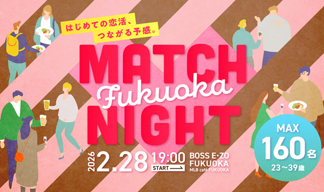 2026年2月28日(土)、最大160名規模の街コンイベント「MATCH NIGHT Fukuoka」をBOSS E・ZO FUKUOKA (福岡市中央区地行浜2-2-6)3F「MLB cafe FUKUOKA」で開催します!