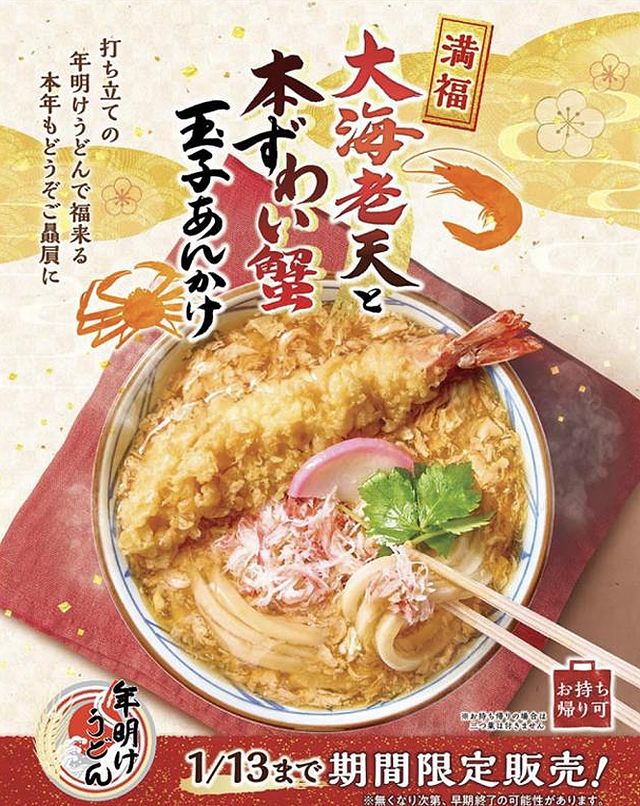 株式会社丸亀製麺が展開する讃岐うどん専門店「丸亀製麺」は、2026年1月3日(土)から1月13日(火)までの期間限定、数量限定で、『大海老天と本ずわい蟹の玉子あんかけうどん』を販売します。