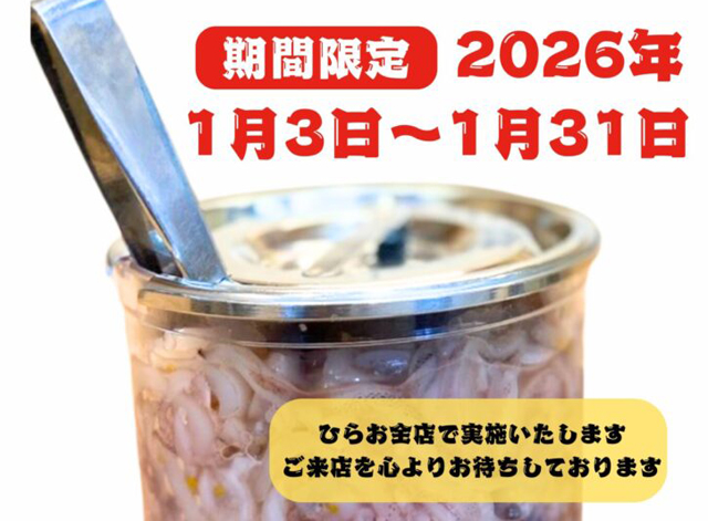 福岡県内に8店舗展開する天ぷら専門店「天麩羅処 ひらお」(本店:福岡市博多区東平尾2-4-1)では、2026年1月3日(土)~1月31日(土)の期間限定で塩辛食べ放題」を実施します。